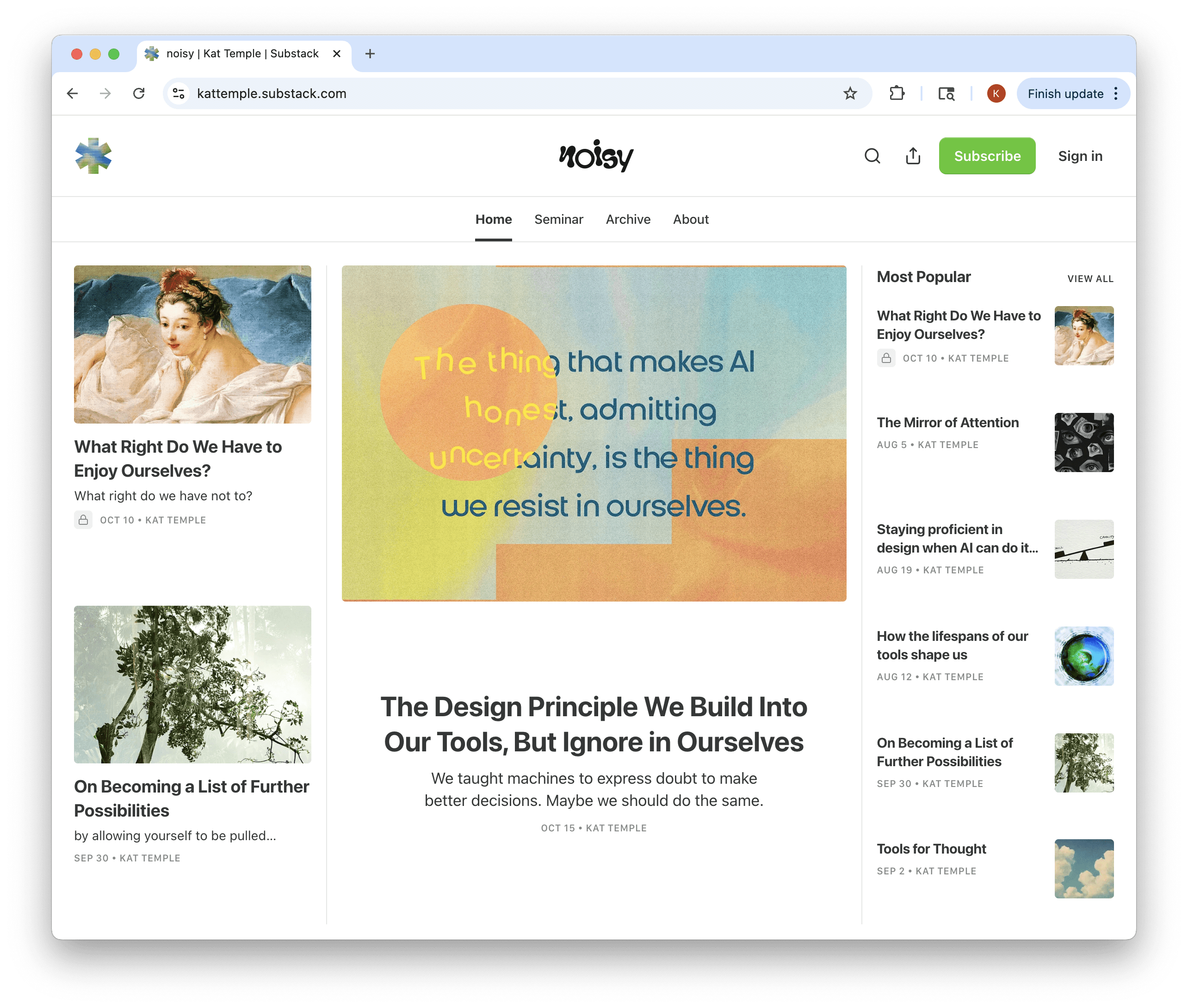 On my aptly named newsletter noisy, I write about digital culture, creativity, and the noisy internet. The best gift I’ve ever received was words that changed how I saw my reality. I want to pay that forward–helping people see technology, design, and culture from different angles.